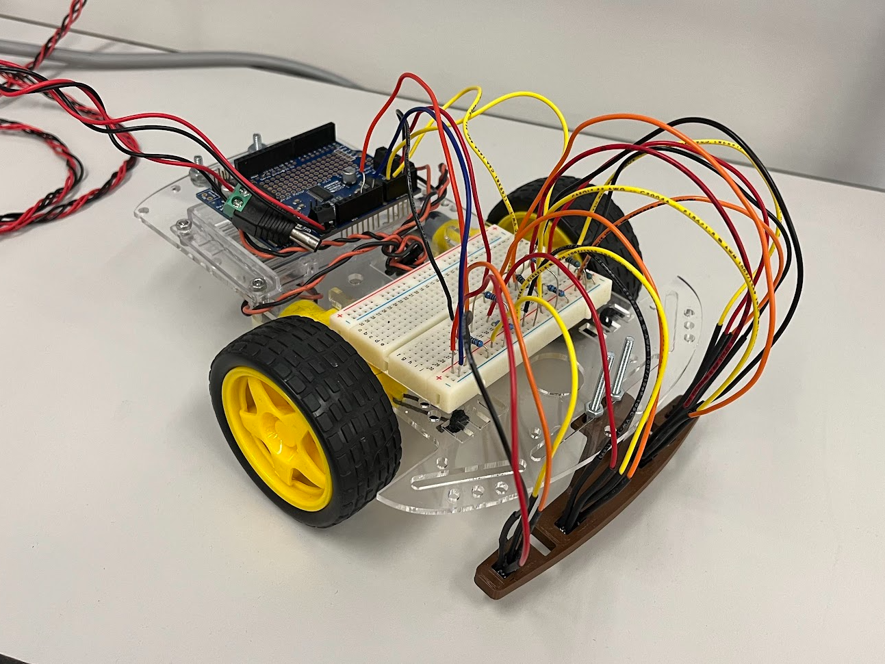 A mini-project for my Principles of Integrated Engineering class, this robot utilizes four IR reflectance sensors to detect and follow a masking tape track on the ground.