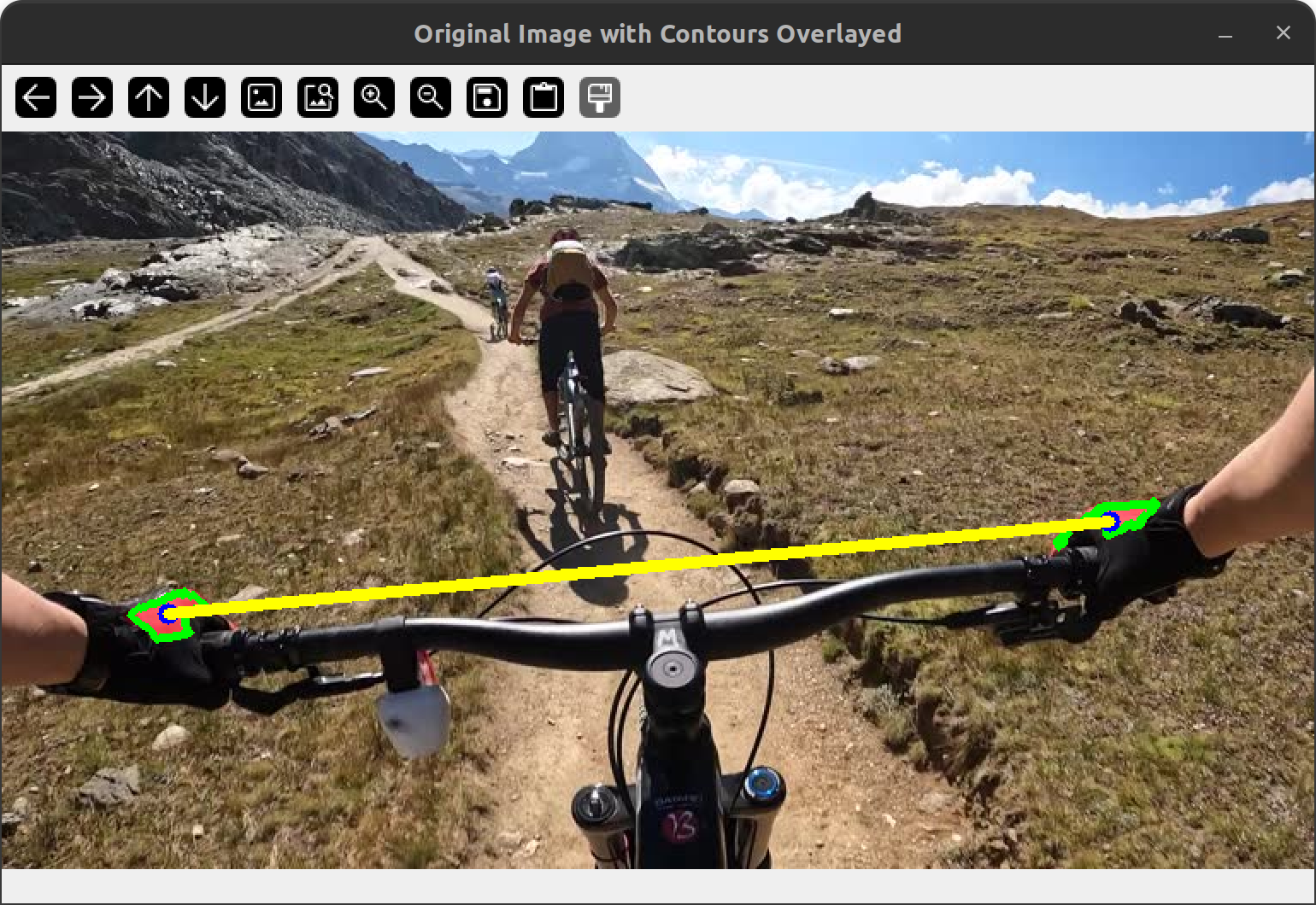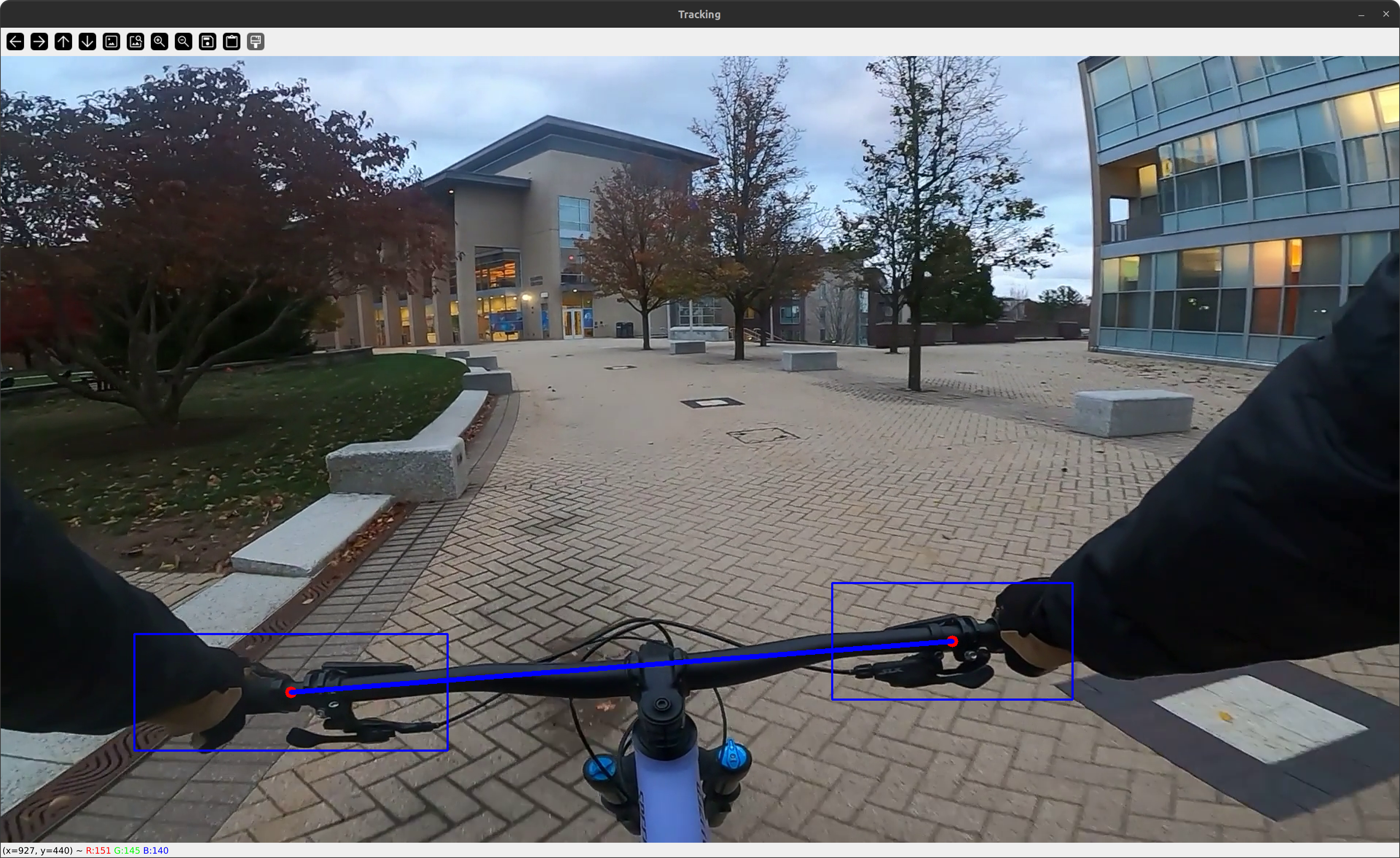 The first iteration of handlebar tracking, using the rider's gloves to create a contour and tracking the angle between the left and right gloves.